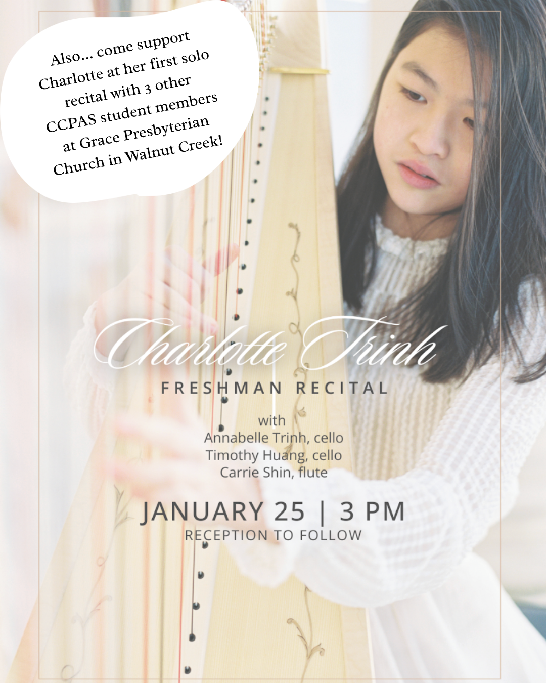 The Contra Costa Performing Arts Society is sponsoring our student member, Charlotte Trinh's Freshman Recital on Sunday, January 25th at 2:00 pm at Grace Presbyterian Church. The address is 2100 Tice Valley Blvd., Walnut Creek, CA 94595.